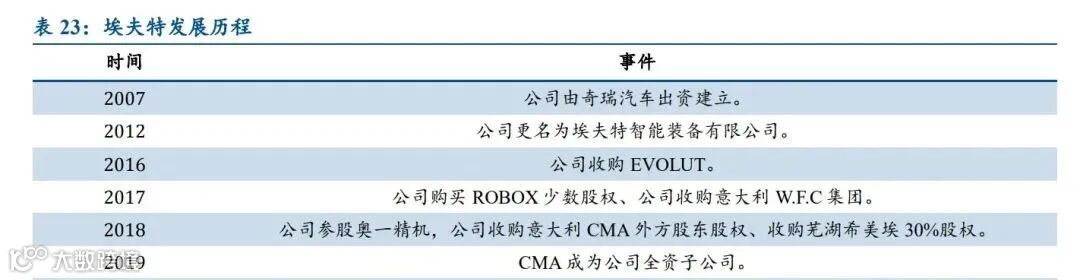 埃夫特源于奇瑞,以系统集成起步,公司从系统集成商逐步拓展到本体和核心零部件的开发制造。公司过去主要通过外延并购快速切入本体和核心零部件,逐步收购CMA、EVOLUT、WFC等海外企业做大做强,逐步拓展喷涂、抛光打磨、切割等应用场景,下游领域覆盖汽车、3C电子、陶瓷卫浴等通用工业。