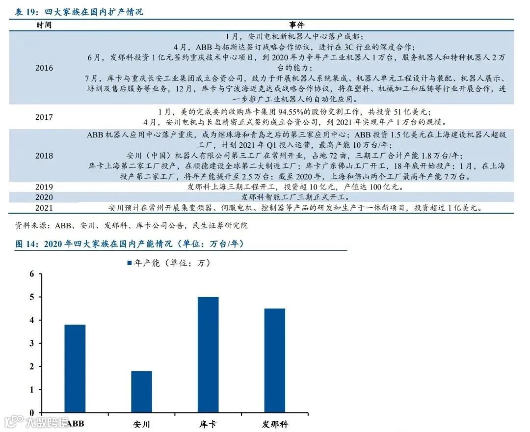 2015年以来四大家族在国内加速扩产:ABB投资1.5亿美元在上海建设机器人超级工厂,并计划于2021年底投入运营,最高年产能达10万台;发那科投资1亿元建设生产基地,到2020年实现年产能约4万台,此外投资15.8亿元建造全球最大的机器人基地“超级智能工厂”,预计到2023年实现月产能约1.1万台;安川与长盈精密成立合资公司,计划到2021年实现年产能约1万台;库卡上海第二家エ厂和佛山エ厂逐步投产,截至2020年,上海和佛山两个工厂最高年产能约达5万台,此外库卡投资建设佛山二期工程,预计2024年完工后可实现年产能10万台。