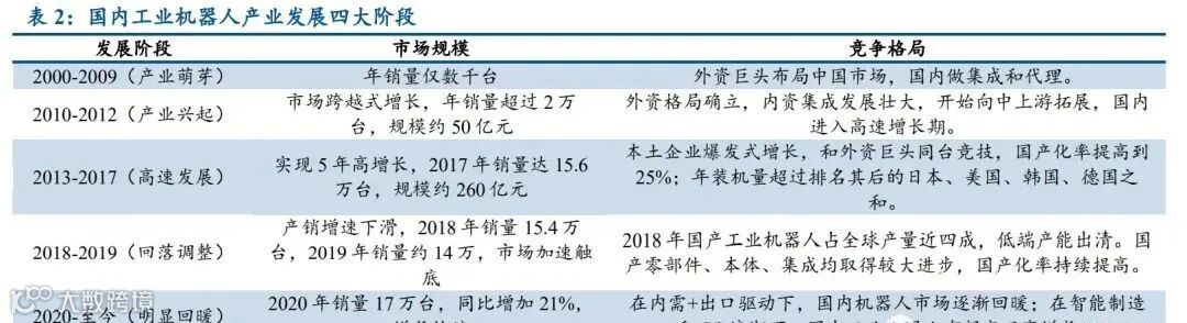 1)萌芽阶段(2000-2009年),在汽车等下游行业较为低迷的背景下,国内工业机器人年均销量仅数千台,外资巨头加速布局国内市场,国产供应商主要做集成和代理。