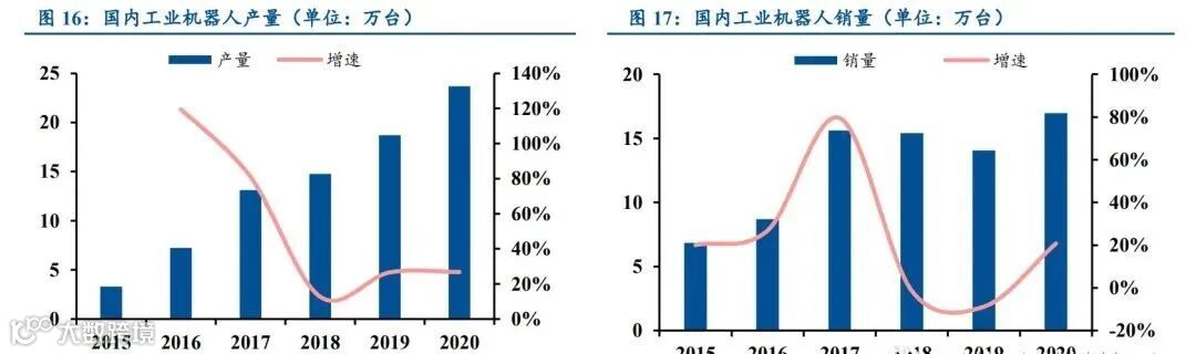 2015-2020年,国内工业机器人产量由2015年的3.3万台提升至2020年的23.7万台,CAGR达48.3%;销量由2015年的6.9万台提升至2020年约17万台,CAGR达19.8%。