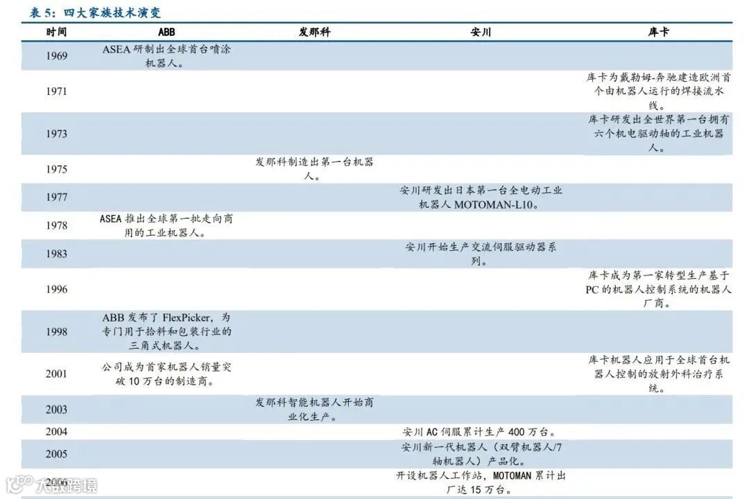 1988年,ABB由AseaAB和BBCBrownBoveriAG合并而成,其中ASEA于1969年研发出全球首台喷涂机器人,开始进入工业机器人研发制造领域,合并后的ABB于2001年成为全球首家机器人销量突破10万台的制造商。