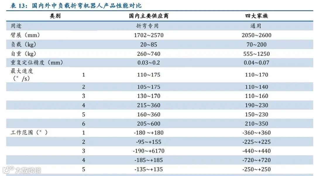 中小负载折弯领域,国产机器人重复定位精度、臂展距离以及最大速度参数与“四大家族”产品接近。国内主要供应商的中小负载焊接机器人重复定位精度约为0.03-0.1mm,接近四大家族产品精度(0.04-0.07mm);臂展方面,国内主要供应商的中小负载焊接机器人最大工作距离能达到2500mm以上,与四大家族差距较小(2600mm);最大速度方面,国内主要供应商的中小负载焊接机器人达110-175mm,与四大家族基本一致(110-170mm)。