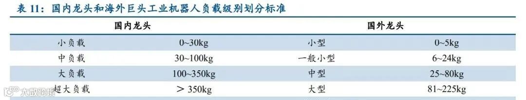 不同企业对工业机器人的负载级别划分标准存在差异。在对国内外工业机器人进行精度比较时,我们采用埃斯顿负载分类标准:小负载(0-30kg)、中负载(30-100kg)、大负载(100-350kg)和超大负载(>350kg)。自由度方面,我们均选取六自由度机器人进行技术参数比较,以确保其技术难度差别不大。