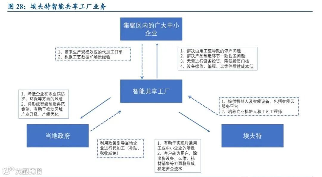 通过集中服务,共享工厂可以实现规模效应,降低企业生产成本、提高生产效率,为中小企业解决自动化升级难的问题;此外,埃夫特可通过共享工厂积累工艺数据和场景经验,加速机器人产品向通用领域的渗透。