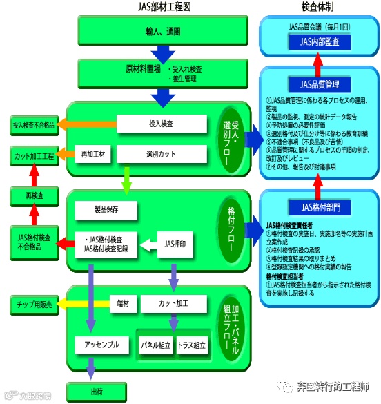 2×4住宅に使用される製材品を「枠組壁工法構造用製材」(海外のディメンションランバーまたは通称2×4ランバー)といいます。 工場では、輸入されたランバーについて受入検査をおこない選別します。 把被2×4住宅使用的木材加工品「框组墙施工方法构造用木材加工」(海外的维数lumber又俗称称为2×4lumber)。Lumber:规格材 我国的组件工厂(说2×4工厂的事),大部分以木材加工品的形式从海外进口木材。 在工厂,关于被进口了的lumber进行受入检验区分。 不是JAS木材加工的木材加工品再我国承认使用的海外的木材加工品以外,必须在JAS认定工厂做检验作为JAS适合品分等级。 選別:製材の含水率、形状および材面の品質を検査して記録する。 格付:上記の検査の結果で、JAS規格により格付し、製材品にJASマークを表示する。 区分:木材加工的水分,检查形状及木材方面的质量记录。 由于分等级:上述的检验的结果,根据JAS规格分等级,在木材加工品表示JAS记号。
