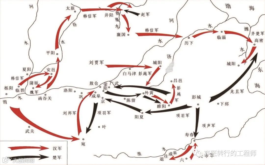 这还没完,当项羽兵力分别在正面、敌后全被刘邦牵制住的同时,张良又提出,派出刘邦麾下的战神韩信,先突破黄河防线,再伺机翻越太行山,杀入华北平原,从而逼近项羽的大本营彭城,相当于又制造了一个侧翼战场。