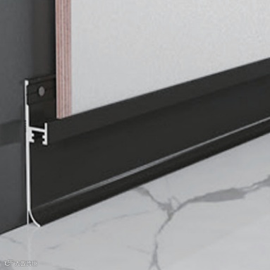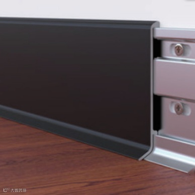 金属踢脚线有不锈钢和铝合金两种材质,以铝合金型材居多,表面处理和铝合金墙板扣条一样,安装主要有胶粘和打钉固定两种方式。相比WPC和实木踢脚线传统的造型,金属踢脚线款式新颖、造型丰富、设计感强,还有带灯光效果的,价格较高。图11~图13中3款仅为示例,具体按照设计风格需求进行相应选择。