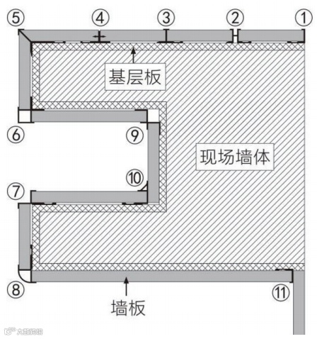 ⑥:方口阳角,两侧墙板嵌入阳角内即可,没有气钉固定,仅起装饰作用;