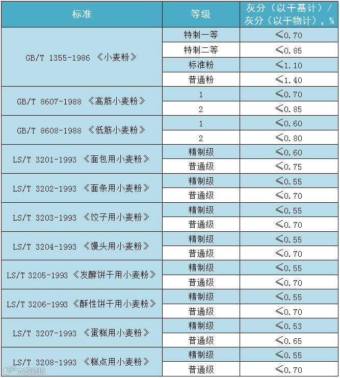 小麦粉种类很多,通常依据蛋白质或面筋质含量和质量的不同,可分为三类:高筋粉、中筋粉和低筋粉。在实际生产中,人们又根据小麦粉的不同用途、加工性能和品质要求,进一步细分为:面条用小麦粉、面包用小麦粉、馒头用小麦粉、饺子用小麦粉等专用小麦粉,并制定了相应的标准。这些标准对小麦粉中灰分的限量要求如下表所示: