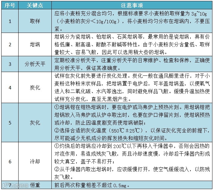 目前小麦粉中灰分的检测方法主要为GB 5009.4-2016《食品安全国家标准 食品中灰分的测定》(第一法 食品中总灰分的测定)。虽然灰分的检测方法比较简单,但是如果检验人员在检测时不注意一些细节,则容易产生测定误差。检测灰分时需要注意的事项详见下表: