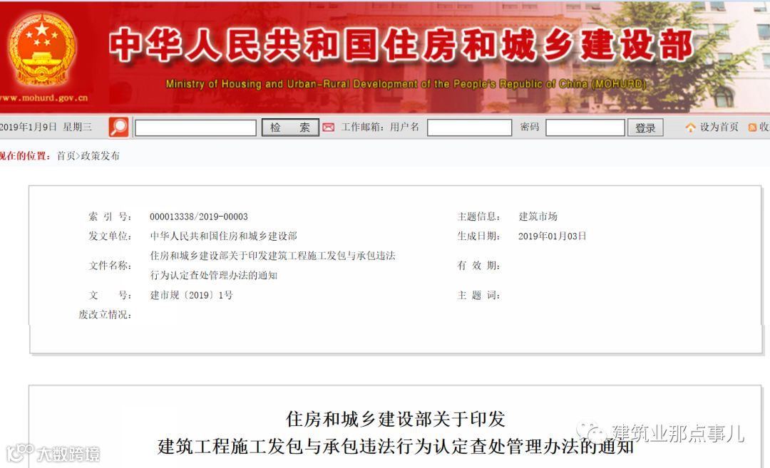 近日住建部官网印发《建筑工程施工发包与承包违法行为认定查处管理办法》(以下称《办法》),《办法》明确提出:存在承包单位将其承包的全部工程转给其他单位(包括母公司承接建筑工程后将所承接工程交由具有独立法人资格的子公司施工的情形)或个人施工的情形,应当认定为转包,本办法自2019年1月1日起施行。