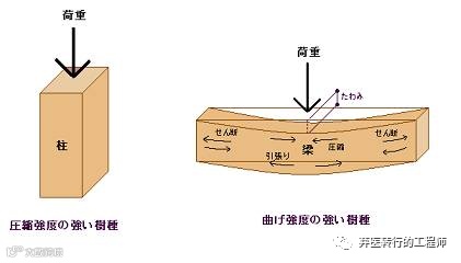 柱材は上階の荷重により材軸方向に強い圧縮力をうけるため、圧縮強度の高い部材を、また 梁材は、材軸の垂直方向から荷重を受けるために、曲げ強度の高い材料を選定することが望ましいです。