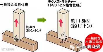 テクノストラクチャーの柱の引き抜き強度は、一般的な木造接合金具を使用した場合と比べて約3倍です。ピンを打ち込むだけで安定した強度を発揮します。 |