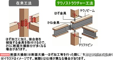 テクノストラクチャーはココが違う!!その② 木と木をつなぐ一般的な方法である「ほぞ加工」。この方法は有効な手段である反面、地震など大きな力が加わった場合、接合部に損傷を受けやすいという弱点があります。そこでテクノストラクチャーでは、断面欠損を最小限に抑え、かつ接合強度を高めた「オリジナル接合金具」を開発し、住宅の強度を高めています。 |