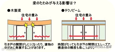 住宅の重みを支える梁には、時間の経過とともに若干のたわみが生じます。 特に木製梁は、荷重がかかり続けるとたわみの変形が年々増やしていくクリープ変形という現象が起こります。 |