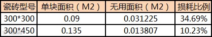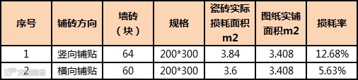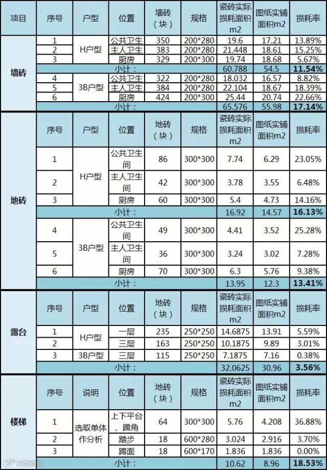 以南通三建在四季花城二期A区3B户型、H户型的瓷砖铺贴为例,其具体分项损耗率如下表: