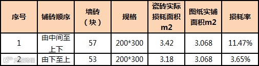 根据统计显示,该项目平均铺贴损耗率为12.78%。有其他数据表明,瓷砖铺贴时的一般损耗率应该为1%至3%左右,房型比较特殊的情况下,损耗率应合理控制在5%—8%范围内,与之相比,四季花城二期A区的瓷砖损耗率过高。