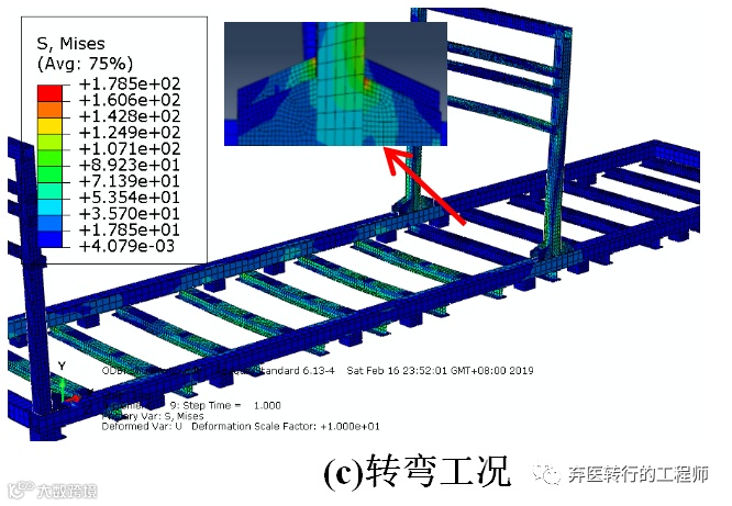 静止工况下搁置架最大应力发生在底部排架工字型横梁支座处腹板与上翼缘相交处,最大应力127.4MPa,小于屈服应力;在紧急制动工况下,最大应力处与静止工况类似,最大应力为129.1MPa,竖向限位架立柱最大应力为50MPa;在转弯工况下,由于受横向力与向心力共同作用,搁置架最大应力发生在竖向限位架底部加腋处,最大应力178.5MPa。