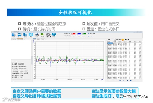 运输测振:通过监测装置记录运输全过程三维振动、冲击、冲撞加速度,对记录到的三轴加速度在时域坐标系显示,能合并显示三轴振动加速度均方根值,能对超标次数、超限率、极大值时刻及其对应时间进行统计。对记录存储的数据统计、查看、分析超限事件波形并按预设的方案输出报表,配套微型打印机可以现场打印测试数据。