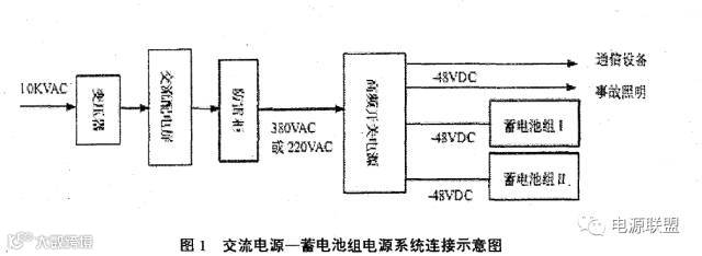 电力通信网中目前数字微波电路还比较多,仍作为传输主干线使用,因此运行的微波站数量较多,分布也较广。微波中继站多是无人站,有的建在高山顶上,运行条件差。微波通信设备采用直流DC一48V供电。站内一般只有一路交流供电,电源系统由室内10K变压器、防雷柜、交流配电屏、高频开关电源和直流DC一48V蓄电池组构成,同时根据微波站实际情况,有的还配置了柴油发电机组、太阳能电池等。蓄电池容量一般按24小时放电率考虑,一些道路条件特别差的站,按1~4天放电率考虑,所以有的站蓄电池配得很大。主要是下面这种电路配置: