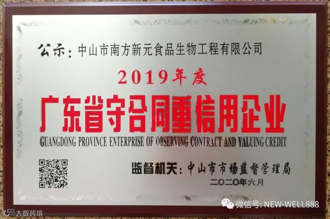 近日,广东省市场监督管理局公布了2019年度“广东省守合同重信用企业”名单,中山市南方新元食品生物工程有限公司凭借自身良好的信用体系建设及诚信守约形象,获得“广东省守合同重信用企业”殊荣!