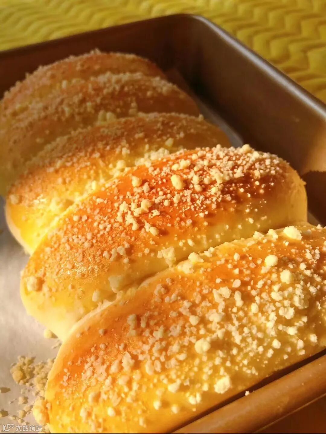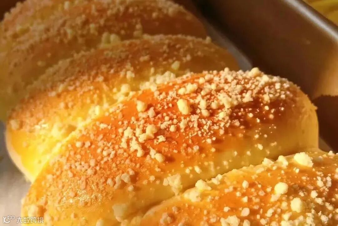 松弛完将面团搓成橄榄型,表面沾湿粘上冰硬的酥粒,放在刷油烤盘里。