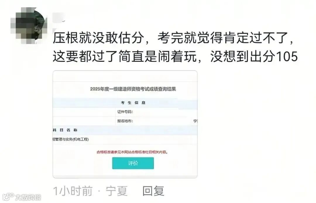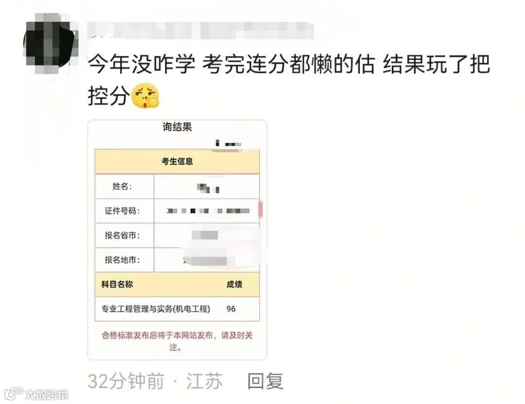 2025 年 12 月 10 日,中国人事考试网正式公布一级建造师成绩,全国考生经历了戏剧性反转:考后考场外 “哀鸿遍野”,考生纷纷吐槽 “题太难做不完”“明年再战”,甚至提前列好复习计划;但成绩公布后,大批考生晒出高分成绩单,直呼 “不敢相信”—— 通信专业考生估分 96 分压线,实际得分 108 分;港航专业考生估分仅 26 分,却凑齐合格科目结束五年备考;机电专业更是 “逆袭重灾区”,不少估分七八十分的考生最终斩获 100+,甚至有选择题仅得 20 多分的考生以 96 分惊险过关。
