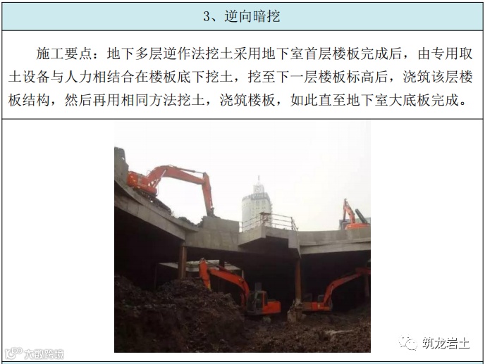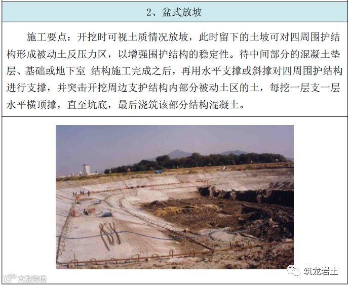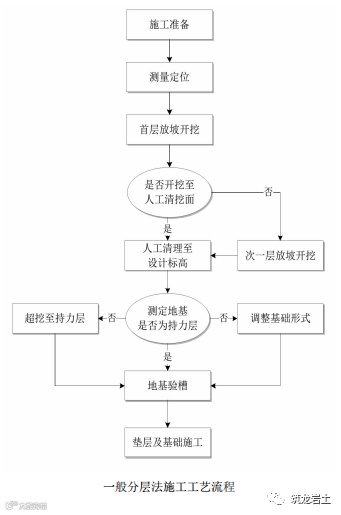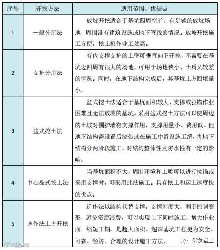 土方开挖常用的方法有一般分层法、支护分层法、盆式挖土法、中心岛式挖 土法及逆作法土方开挖等,工程中可根据具体条件选用。