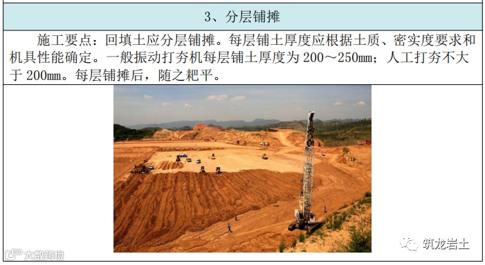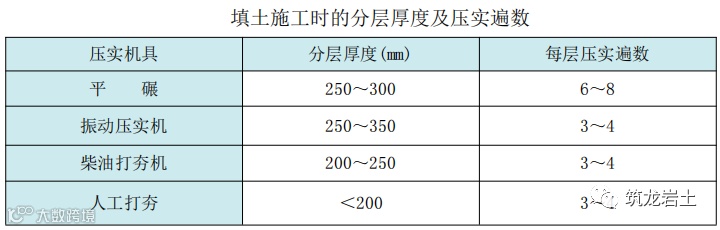 (3)填方施工过程中应检查排水措施,每层填筑厚度、含水量控制、压实 程度。填筑厚度及压实遍数应根据土质,压实系数及所用机具确定。