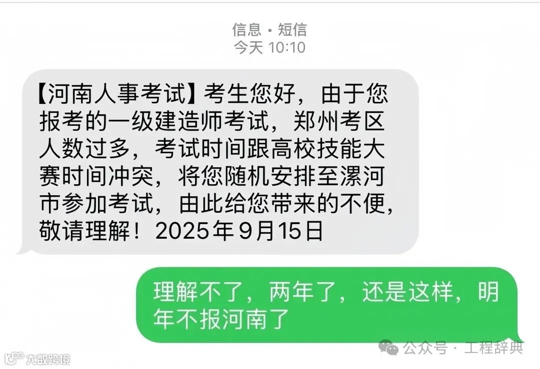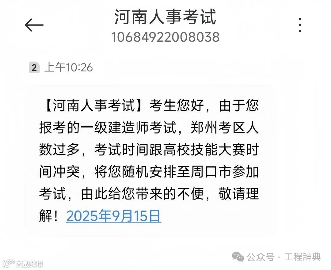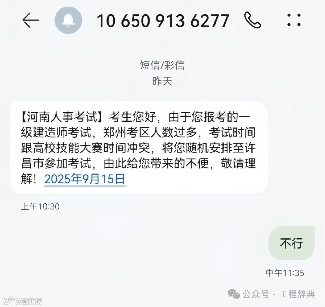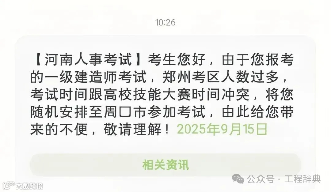 最近,河南一批一建考生的手机突然弹出了一条通知短信,内容看得人头皮发麻:因郑州考区人数超额,且考试时间与高校技能大赛冲突,部分考生被随机调配至周口、漯河等外地城市参考。