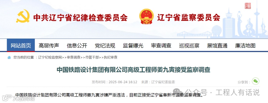 据辽宁省纪委监委消息,中国铁路设计集团有限公司高级工程师姜九寅涉嫌严重违法,目前正接受辽宁省阜新市监委监察调查。