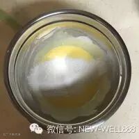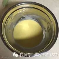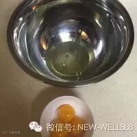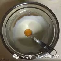 6. 拿走热水,倒入烤箱底层托盘内,180度开始预热。盆内加入蛋黄,分三次放入,搅拌均匀。