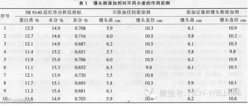 面对如此复杂的面粉添加剂我的建议是:如果你没有把握,你可以选择合适的市场,生产不添加任何添加剂且适合客户需求的面粉,比如当地的老百姓市场,这样至少可以降低一些风险。在这里,我为大家提供馒头粉添加剂对不同小麦作用的一些实例,说明这个道理,供大家参考。实验设备为开封市茂盛机械有限公司生产的3B、3M的实验磨,IM 9140近红外分析仪、测量馒头的工具等。所用的面粉都是3B、3M实验磨的混合统粉,润麦也是在实验室操作的,馒头粉添加剂使用的都是同一种添加剂,加水量也一样,其中序号2、4、8添加后,馒头有皱皮,微缩,序号7馒头缩死,参见表1。