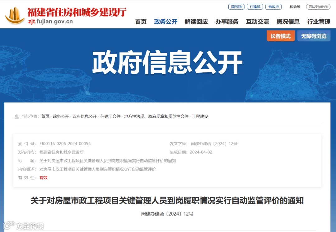 4月9日,福建省住建厅印发《关于对房屋市政工程项目关键管理人员到岗履职情况实行自动监管评价的通知》(闽建办建函〔2024〕12号)。
