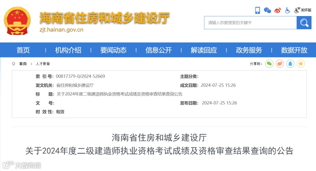 海南省住建厅发布《关于2024年度二级建造师执业资格考试成绩及资格审查结果查询的公告》。