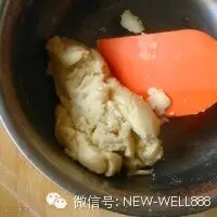 3. 黄油加热融化,关火,趁热加入低筋面粉,快速拌合成面团;