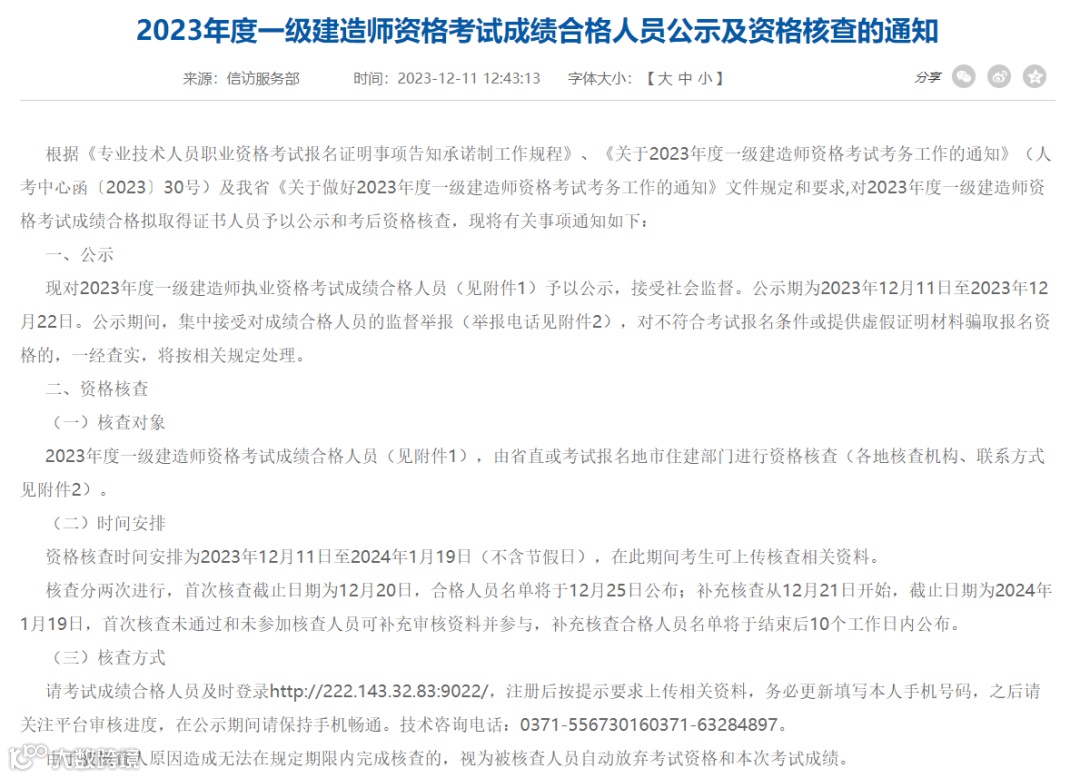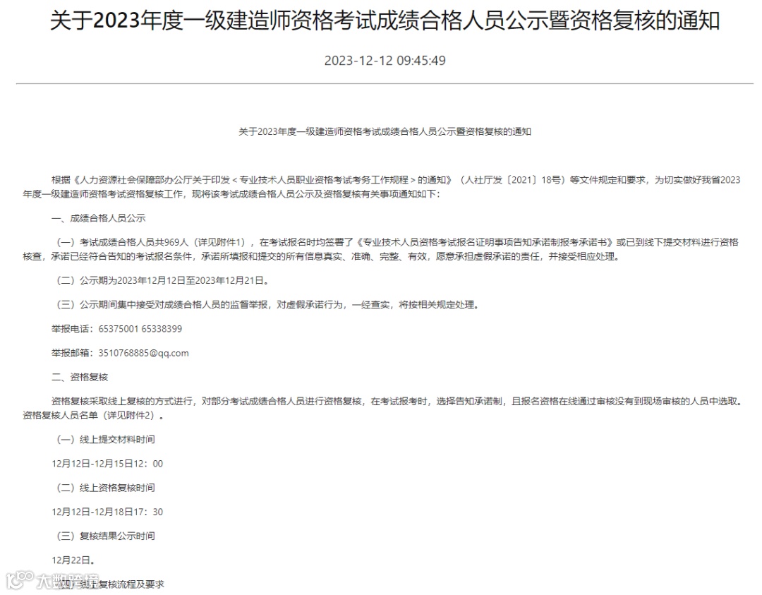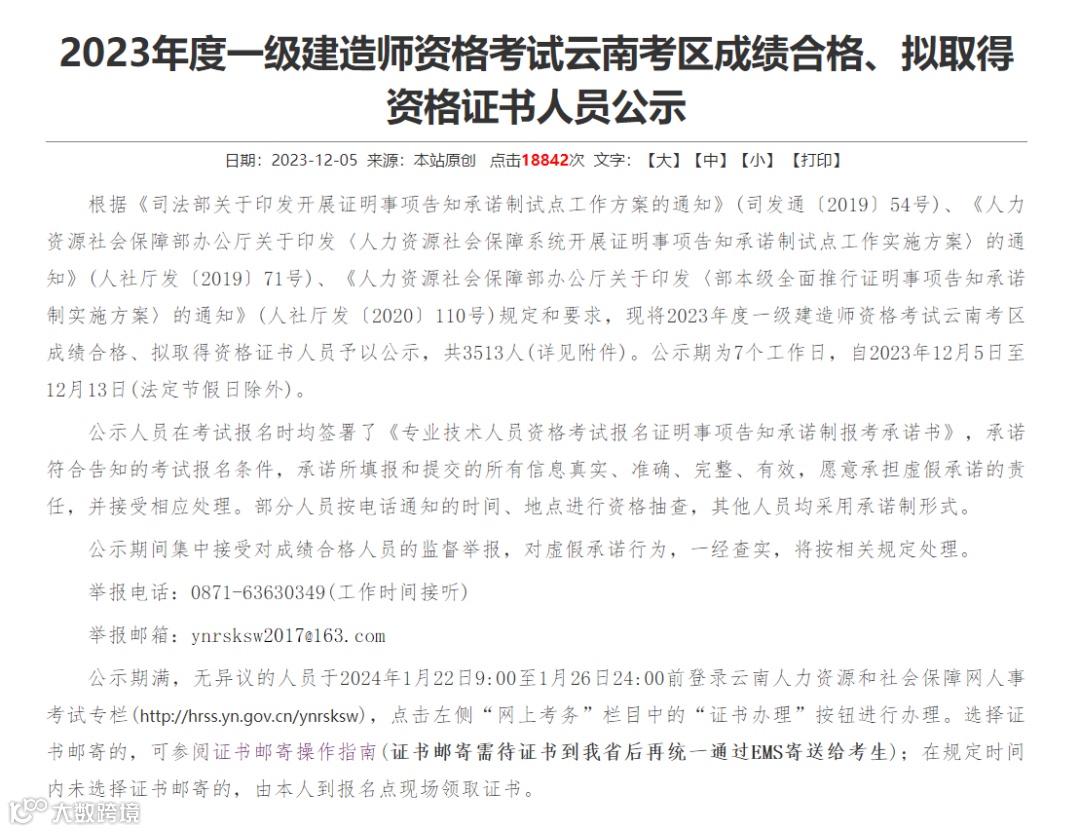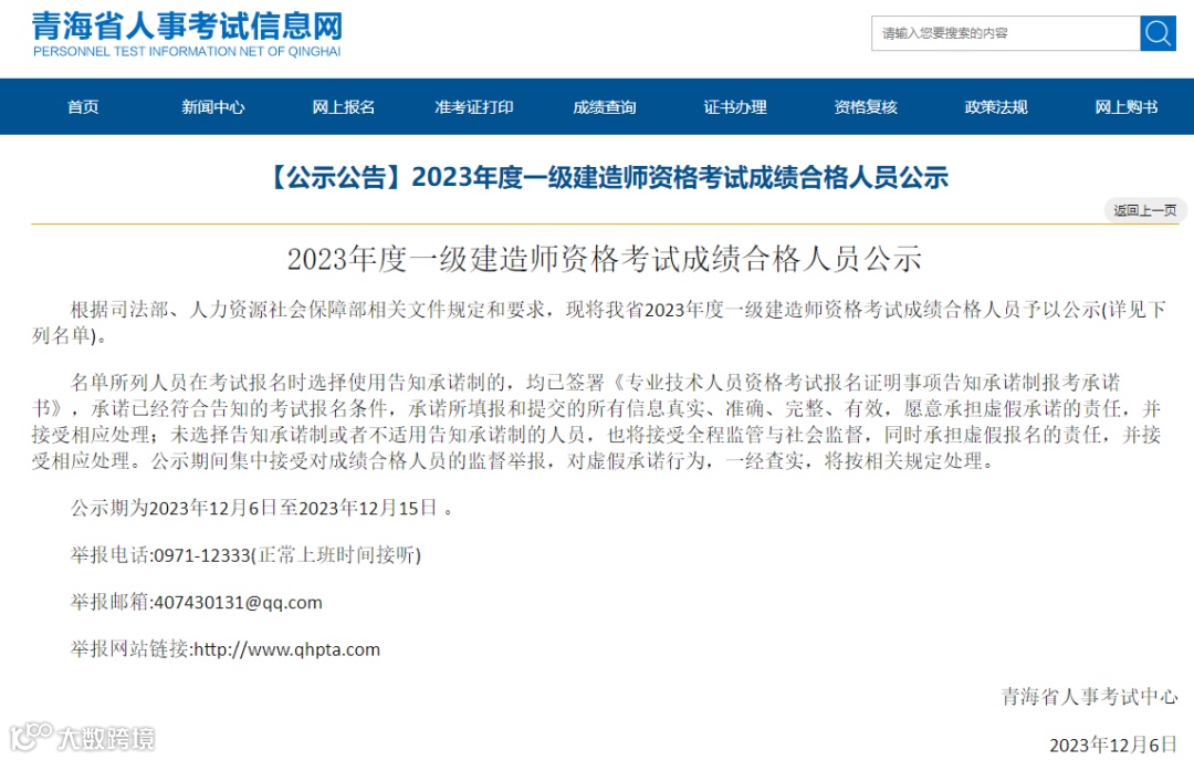 现对2023年度一级建造师执业资格考试成绩合格人员(见附件1)予以公示,接受社会监督。公示期为2023年12月11日至2023年12月22日。公示期间,集中接受对成绩合格人员的监督举报(举报电话见附件2),对不符合考试报名条件或提供虚假证明材料骗取报名资格的,一经查实,将按相关规定处理。