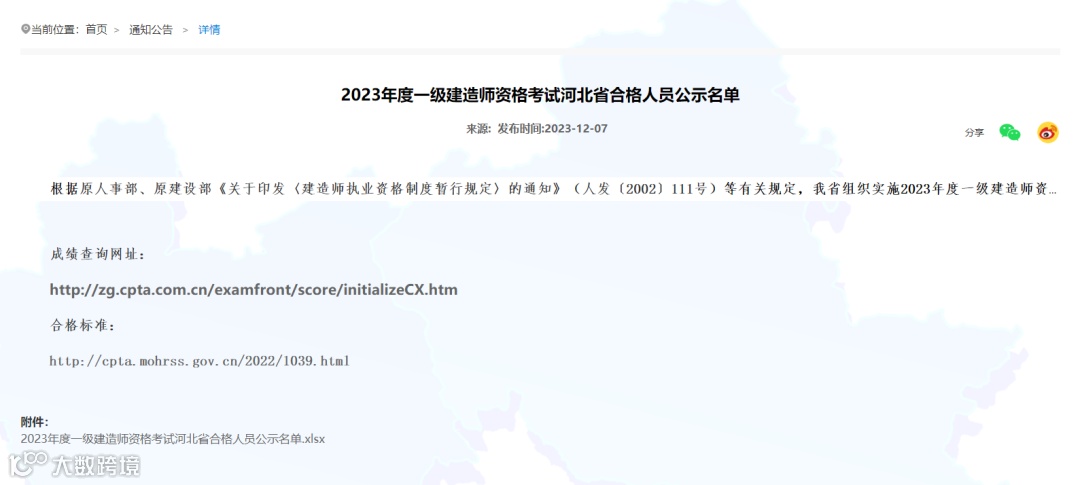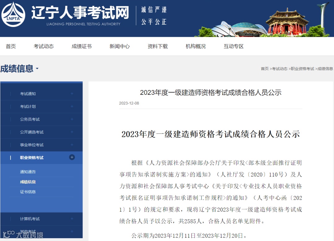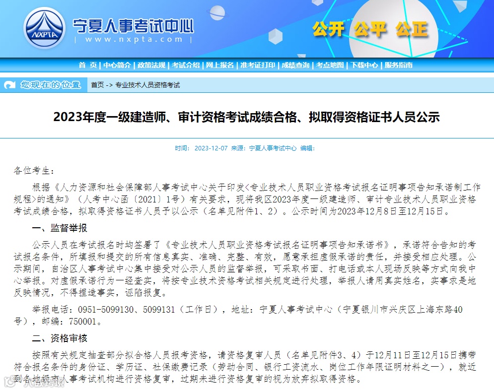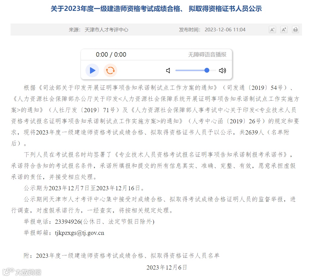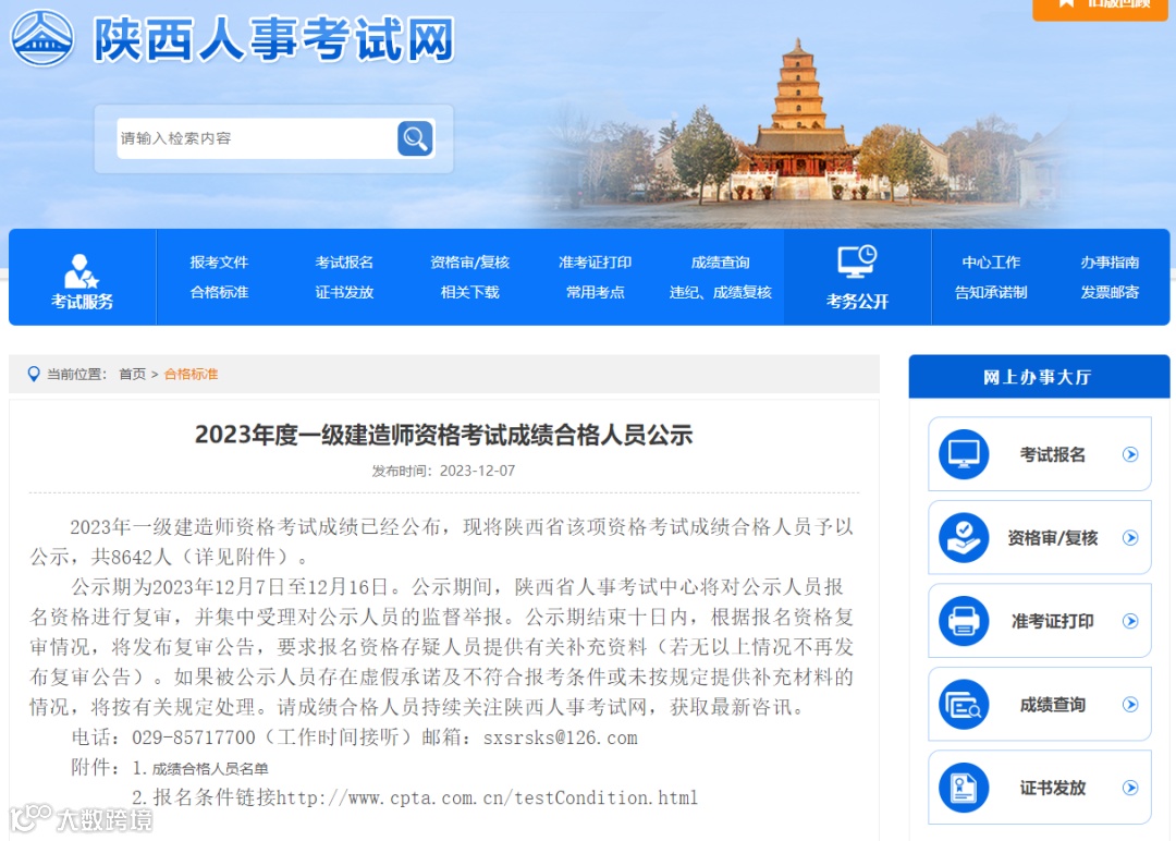 现对2023年度一级建造师执业资格考试成绩合格人员(见附件1)予以公示,接受社会监督。公示期为2023年12月11日至2023年12月22日。公示期间,集中接受对成绩合格人员的监督举报(举报电话见附件2),对不符合考试报名条件或提供虚假证明材料骗取报名资格的,一经查实,将按相关规定处理。