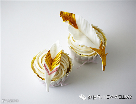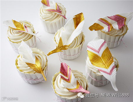 将装饰好的翻糖羽毛放在糖霜纸杯蛋糕上,即可享用。注意不要放冰箱冷冻,因为如果冰箱潮湿的话,翻糖羽毛会变软导致变形。