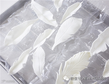 在托盘铺一层气泡垫或一张皱巴巴的纸巾,或者任何可以让羽毛放置定型的东西都可以。撒上一些糖粉以免翻糖羽毛会粘着气泡垫。然后将翻糖羽毛放在上面,等晾干后会看起来栩栩如生的。
