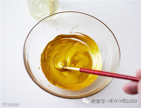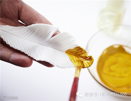 用手轻轻拿起翻糖羽毛,放在左手,手指支撑着羽毛以防变型,右手为羽毛上色。然后随意地用画笔刷上金色色粉混合物,再放回气泡垫上晾干。注意:这个色粉混合物会慢慢挥发,变得越来越稀,如有需要,可以在刷羽毛的过程中再加一点酒精或者香精。