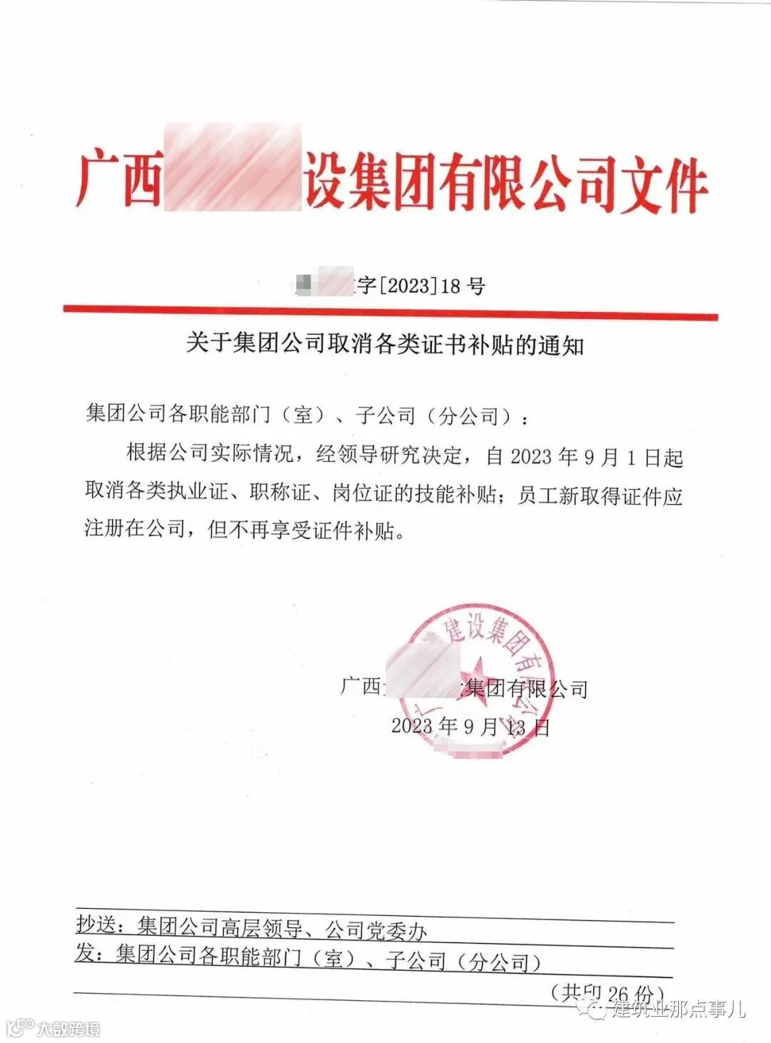 近日,网传广西某国有参股大型建筑企业集团发布通知,取消各类证书补贴。