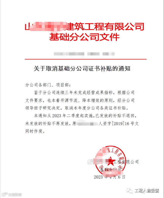 无独有偶,4月6日,山西某建筑公司也取消了证书补贴的通知。根据分公司连续三年未完成指标,公司也开源节流,取消本年度分公司各类证书补贴。