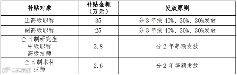 正高级职称人才补贴35万元/人;副高级职称人才补贴25万/人;中级职称人才补贴3.8万/人。