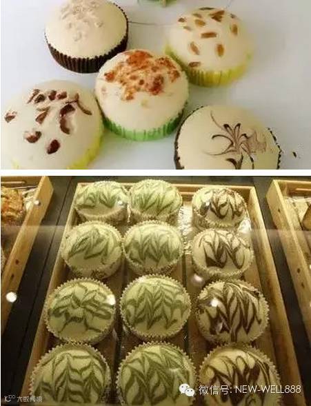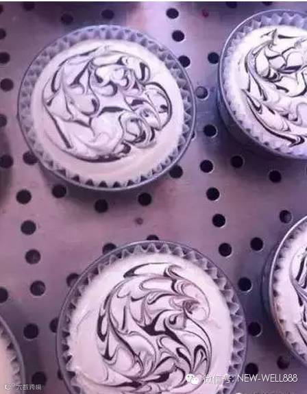 4.把3倒入模具中(约60g/个),放入90℃的蒸炉中,蒸约20~22分钟。(取出部分面糊,调上适量的可可粉或绿茶粉即可制作花纹,另外在入炉前可洒上蔓越莓、杏仁片或者其他装饰)