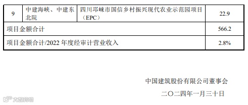 8.中建三局、中建铁投:辽宁沈阳航空航天城基础设施建设项目工程总承包项目,项目金额24.7亿元; 9.中建海峡、中建东北院:四川邛崃市国信乡村振兴现代农业示范园项目(EPC),项目金额22.9亿元;