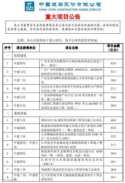 中国建筑股份有限公司发布中标重大项目公告。近期,公司获得如下重大项目: