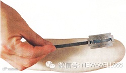 以姆指、食指及中指轻轻持刀,刀刃不要过于直立在面团上。