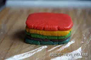 6、把五种颜色都做好,然后放在铺了保鲜膜的案板上,擀成长方形;