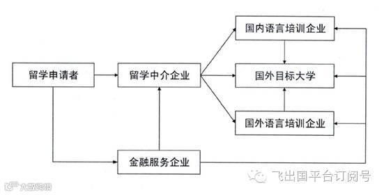 ①留学申请者寻找留学中介,选择其中一家为其提供留学服务并通过金融服务企业支付一定的中介费用;